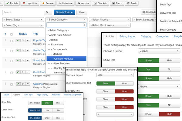 İpucu: Her arabirim ve bileşen, sıralama, filtreleme ve organizasyon seçeneklerinden, içerik görüntüleme kontrollerinden (başlık, yazar, tarih vb.), Sayfa görüntüleme kontrollerinden, blog sayfası düzenlerinden (evet Joomla! blog olabilir), her şeyi kontrol etmek için çeşitli seçenek ve ayarlara sahiptir. Meta veriler, SEO ayarları ve daha fazlası. Bakacağınız yeri biliyorsanız, kaputun altında çok fazla kontrol ve güç var.