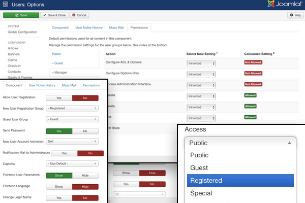 Kullanıcı kaydı ve özelleştirilebilir erişim kontrolü Joomla! 'nın çekirdeğinde yerleşiktir. Joomla! da temel kullanıcı hesaplarını, kullanıcı kayıtlarını, kullanıcı erişim seviyelerini, içerik kısıtlamalarını ve yönetici arayüzü kısıtlamalarını ayarlamak çok kolay. Standart ACL seviyeleri yeterli değilse, herhangi bir çekirdek özellik ve çoğu üçüncü taraf uzantısında istediğiniz tüm özelleştirilmiş izin ayarları ile ihtiyaç duyduğunuz sayıda özel düzey oluşturabilirsiniz. Hepsi Joomla! 'nın merkezinde inşa edilmiş ve baştan başlamaya hazır.
