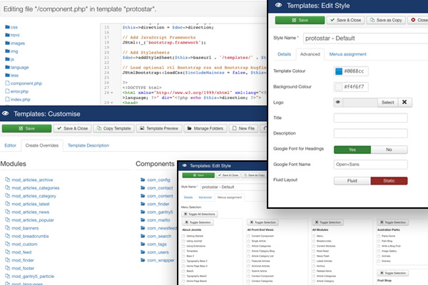 Joomla!, basit veya karmaşık tasarım gereksinimlerini birçok farklı şekilde ele alabilir. Joomla! da, istediğiniz kadar çok şablon yükleyebilir ya da ayarları tek bir şablon için istediğiniz sayıda geçersiz kılma oluşturabilir ve sayfa bazında varyasyonları atayabilirsiniz.