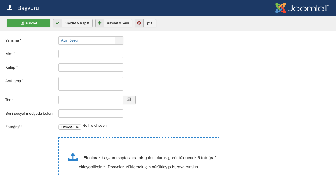 - Gruplama Alanı: Yarışma tamamlandığında girişleri gruplandırmak için kullanılacak alanı seçin. Sitemize göre şehir veya kulüp olmalı.