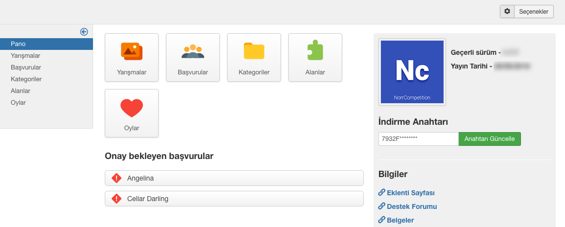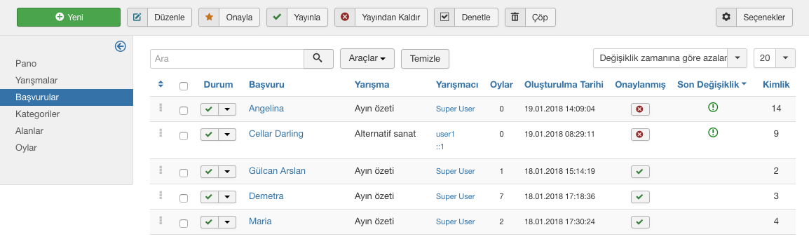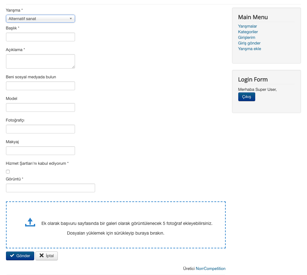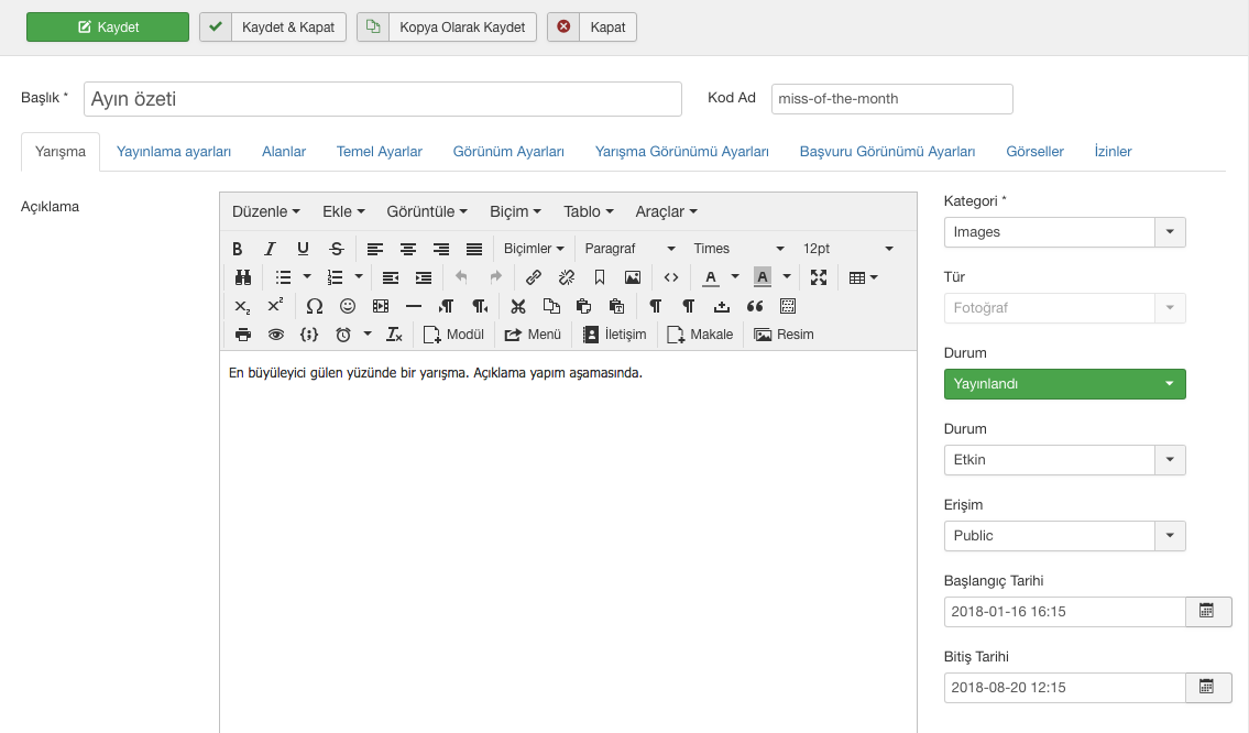 - Yarışmalar: Yarışmaların 3 türü vardır: fotoğraf, video ve basit. Yarışma oluşturulduğu takdirde, katılımın yarışma ile ilişkilendirileceğinden, türü değiştiremezsiniz. Sekmelerle gruplandırılmış bir grup ayar vardır, böylece yarışmalarınızı ihtiyaçlarınıza göre yapılandırabilirsiniz. Konuklar ve kayıtlı kullanıcılar giriş formuyla giriş yapabilirler. Yarışma aktif veya tamamlanmış olabilir.