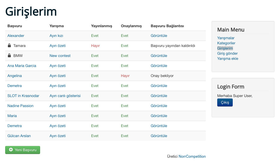 - Girişler: Girişler, bileşen öğeleri olarak adlandırılır. Giriş, yarışmada yönetici tarafından onaylandıktan sonra görünecektir.