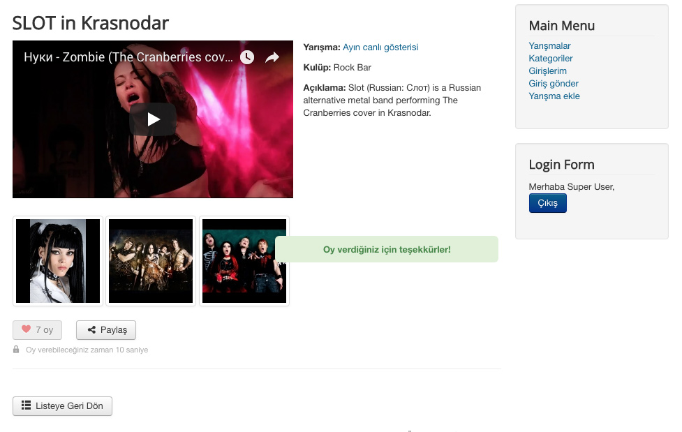 3. yarışma, yerel müzik kulübü'nde / barda kaydedilen canlı performanslara adanmıştır. Yeni grupların daha fazla dikkat ve tanınma almasına yardımcı olacak. Sosyal medya kanallarında ilan ederek yarışmayı teşvik etmenize yardımcı olabilirler. Sonuç olarak, her grup kendi hayranlarını oy kullanmaya çekecek ve işitilmeniz büyüyecek. Ayrıca iki yeni alan ekledik: kulüp adı ve açıklaması (şov hakkında kısa bir bilgi sağlamak için).