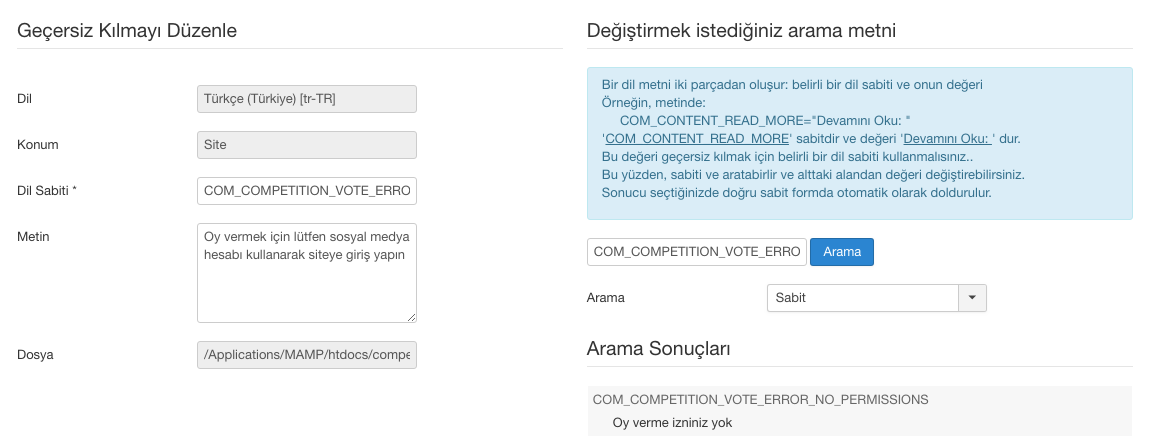 Şimdi, kullanıcıya önce siteye giriş yapmasını isteyen özel bir mesaj ile "oy verme yetkiniz yok" mesajını verelim. Joomla! dili geçersiz kılma ile kolayca yapılabilir.
