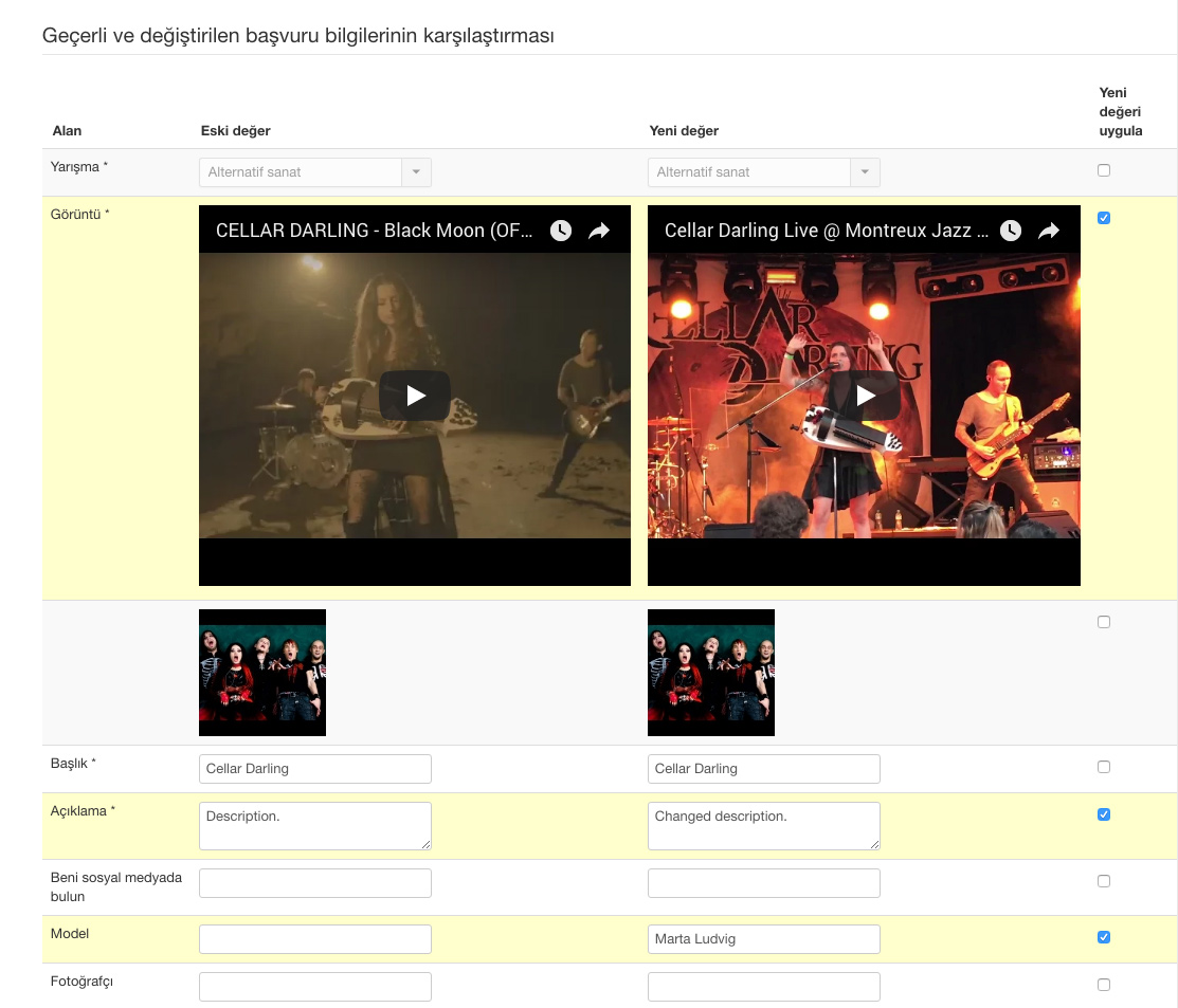 Düzenle'ye geçin ve bir karşılaştırma modunu iki parçaya bölünmüş olarak görebilirsiniz: sol kısım eski içerikten oluşur ve değişen içerik sağ tarafta görüntülenir. Kullanıcı tarafından değiştirilen medya ve alanlar sarı renkle işaretlenir. Moderatör ayrıca alanları değiştirebilir.