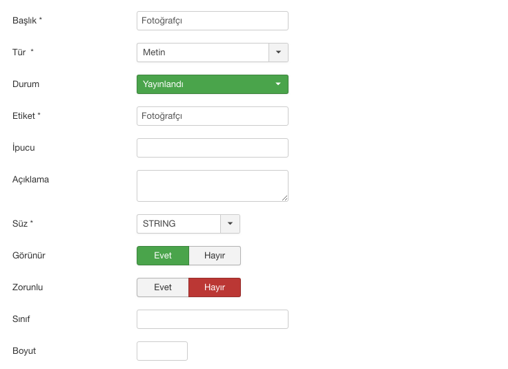 - Metin: Giriş alanı. Bu alan için bir filtre var.
