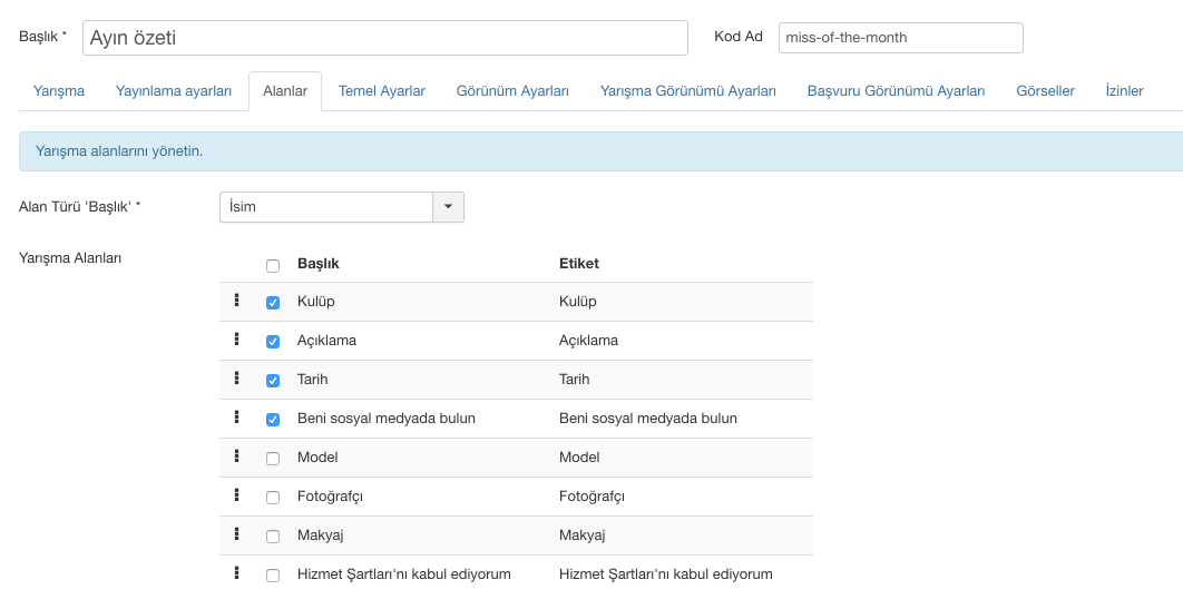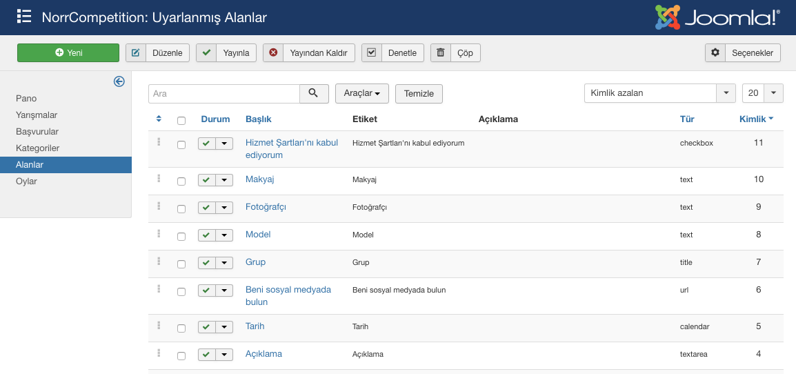 - Alanlar: Yarışmalara atanabilecek özel alanlar. Sadece bir başlık, metin alanı, onay kutusu vb. oluşturabilirsiniz. NorrCompetition, Joomla! alanları ile ilişkili olmayan kendi alanlarını kullanır.