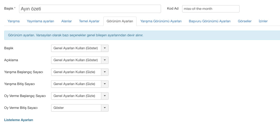 Yarışma ayarlarıyla parametrelerin çoğunu geçersiz kılabilirsiniz. Bu şekilde parametreler, genel bileşen seçenekleriyle varsayılan olarak ayarlanabilir, ancak bazı özel parametreler ayarlamanız gerekirse, yarışma ayarları aracılığıyla bunu yapabilirsiniz. Örneğin, her satırda veya izinlerde birtakım girişler olabilir: sadece kayıtlı kullanıcılar ilk yarışmaya giriş yapabilir, ancak ikinci yarışmada bile katılımcılar giriş yapabilirler.
