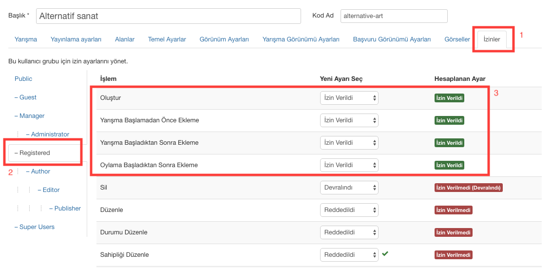 Ve en ilginç yarışma - Alternatif Sanat . Bir öncekinden farklı olarak, bu yarışmanın özelliği kullanıcıların giriş yapmasını sağlıyor. Bu girişler, ön uçtaki özel bir form aracılığıyla gönderilebilir. Yönetici tarafından onaylandıktan sonra, katılım yarışmaya girecektir. Kullanıcıların varsayılan olarak giriş göndermesine izin verilmez, ancak genel seçenekleri geçersiz kılarak doğru izinleri ayarlayacağız. İlk 4 parametreyi bulmak Git> İzinler sekmesini düzenleyin.