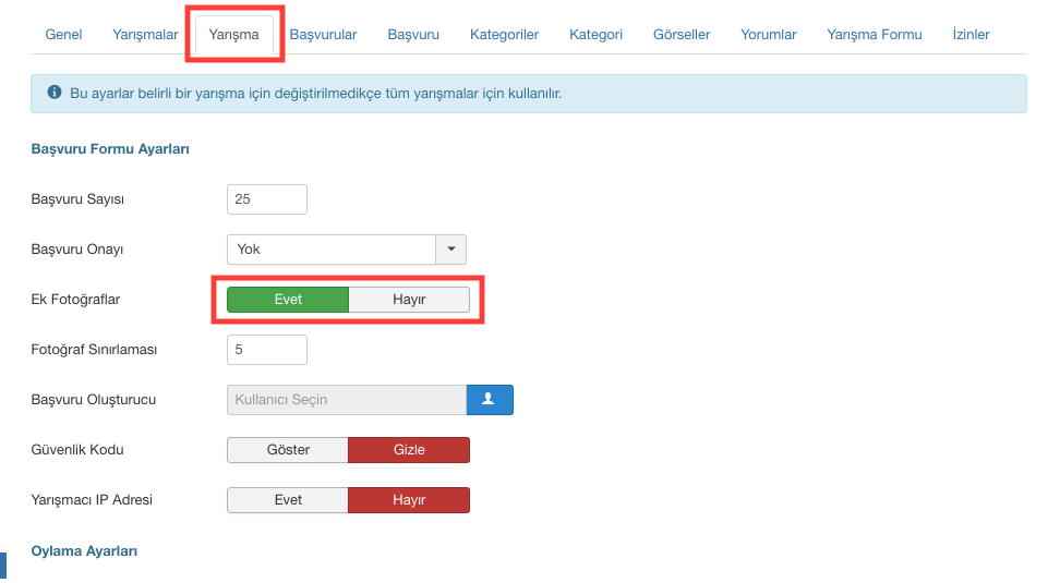 Burada, Oylama Frekansı, Giriş başına Maksimum Oylar, kullanıcının giriş başına oy kullanabileceği (örneğin, tekrar oy kullanma yeteneği), haksız oylamadan korunma sağlamak için çeşitli kontrol prosedürleri vb. Ayarlayabilirsiniz. Geleneksel olarak, bu parametreler yarışma ayarlarında geçersiz kılınabilir.