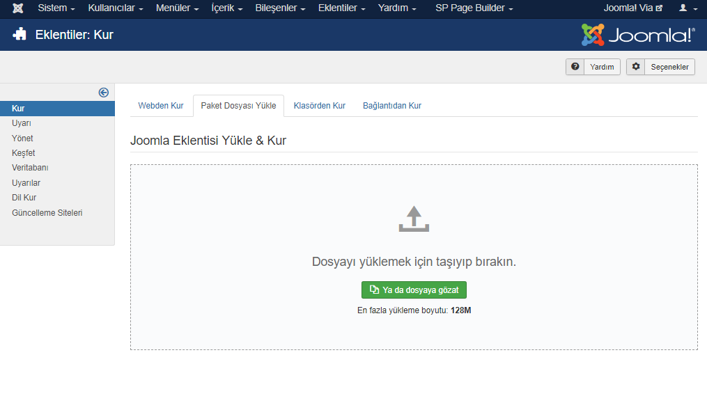 İndirmeyi tamamladıktan sonra, farklı Joomla! sürümleri için ayrı "jSecure Lite" barındıran sıkıştırılmış bir klasöre sahip olacaksınız. Şimdi Joomla! yönetici panelinize gidin. Eklentiler> Yönet alanına geçiş yapın. Orada "Paket Dosyası Yükle" şeklinde bir seçenek olacak. Joomla! sürümünüze uygun jSecure Lite eklentisini yükleyin.