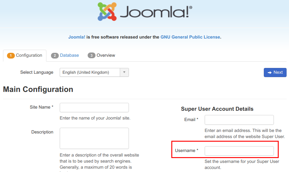 Emin olmak istediğiniz bir sonraki şey, Joomla! web siteniz için güvenli bir kullanıcı adı, şifre ve veritabanı adı olmasıdır. Joomla! 'yı manuel olarak kurarsanız, bunlar genellikle CPanel'de ayarlanır.