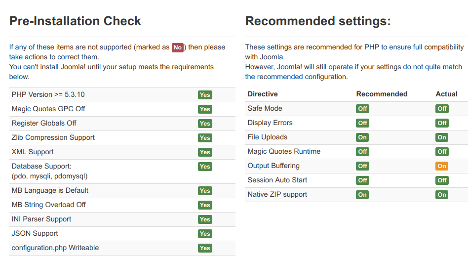 Daha sonra düzeltmek için Joomla! 'yı yüklemeyin. Sunucu firmanızın bunları onardığından emin olun ve ardından Joomla! kurulumunuza devam edin. Ana makineniz bu ayarları düzelttikten sonra, yüklemeye devam etmek için Yükle'yi tıklayın.
