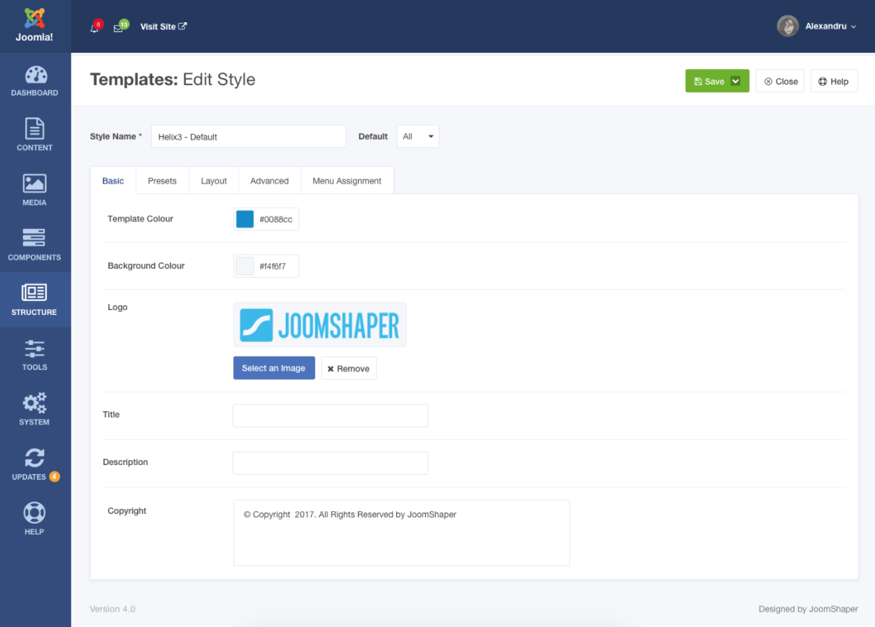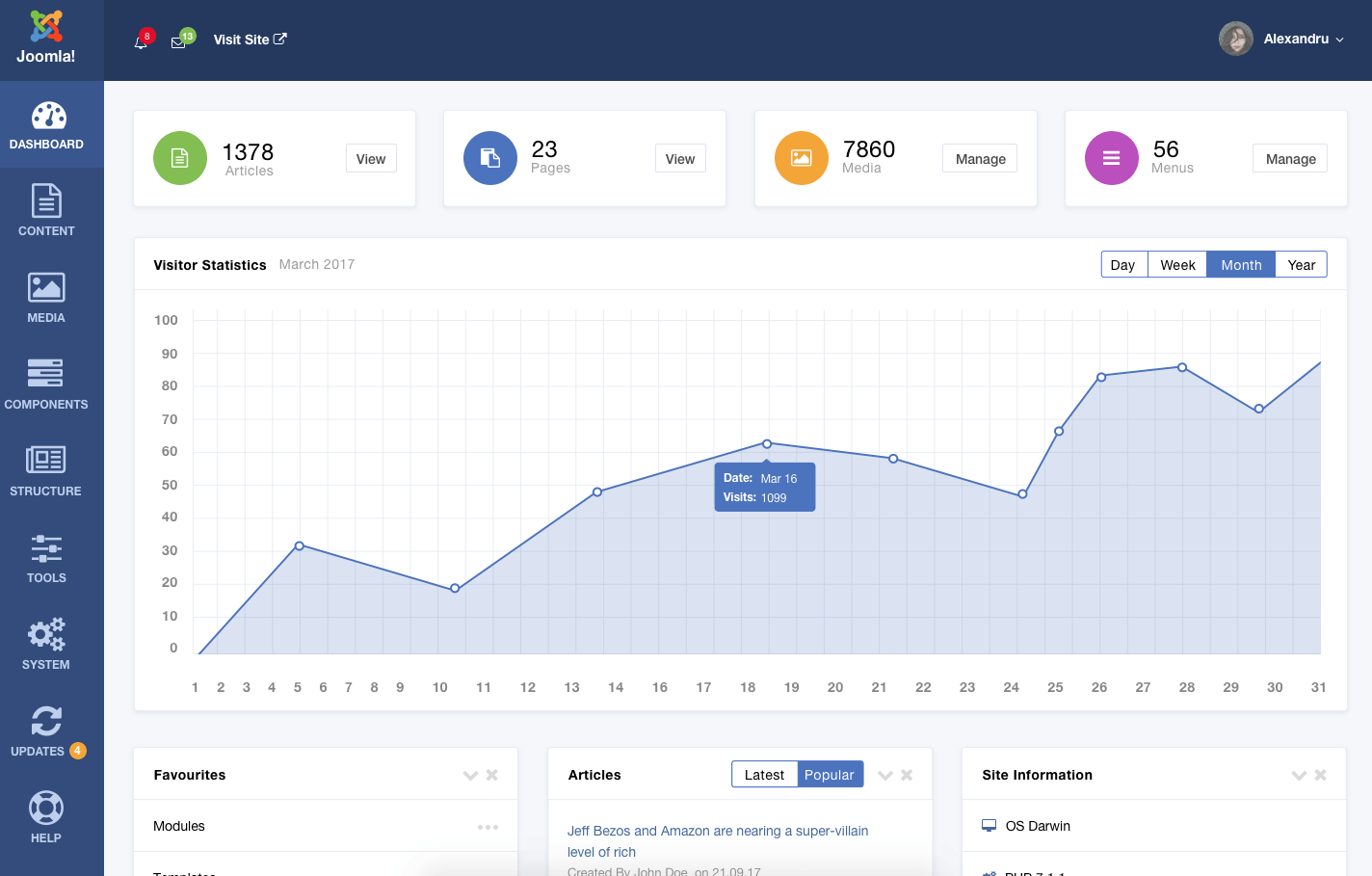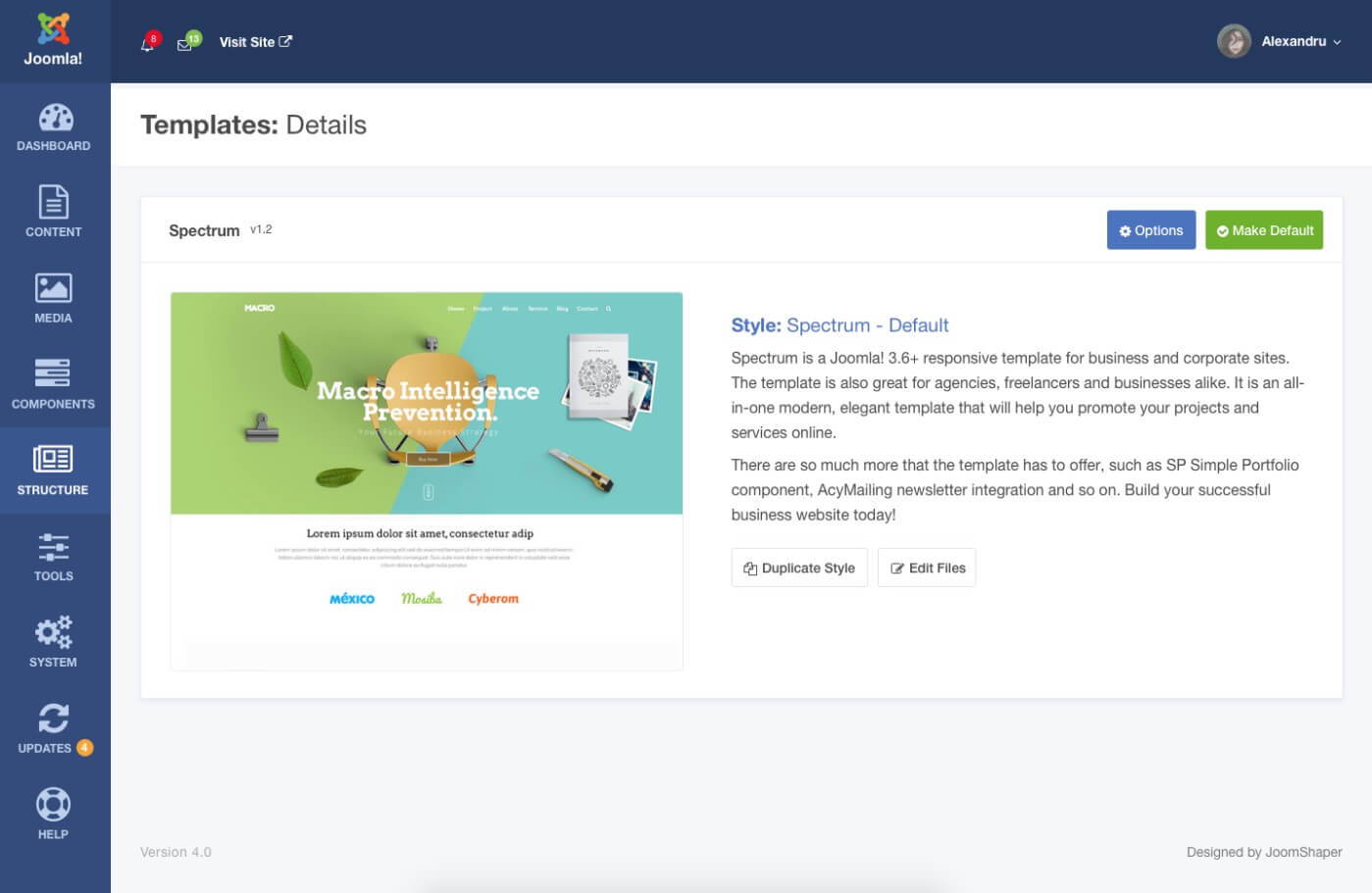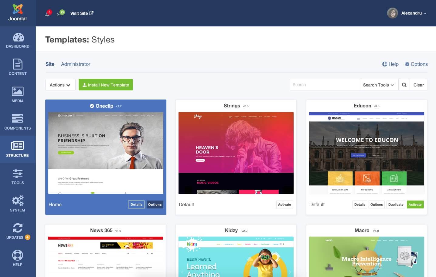 Joomla! 4 konsept admin panel tasarımında, şablon yönetimi, menü organizasyonu dahil tüm site yapısının kontrol edilebileceği birleşik bir yer hazırlanmış.