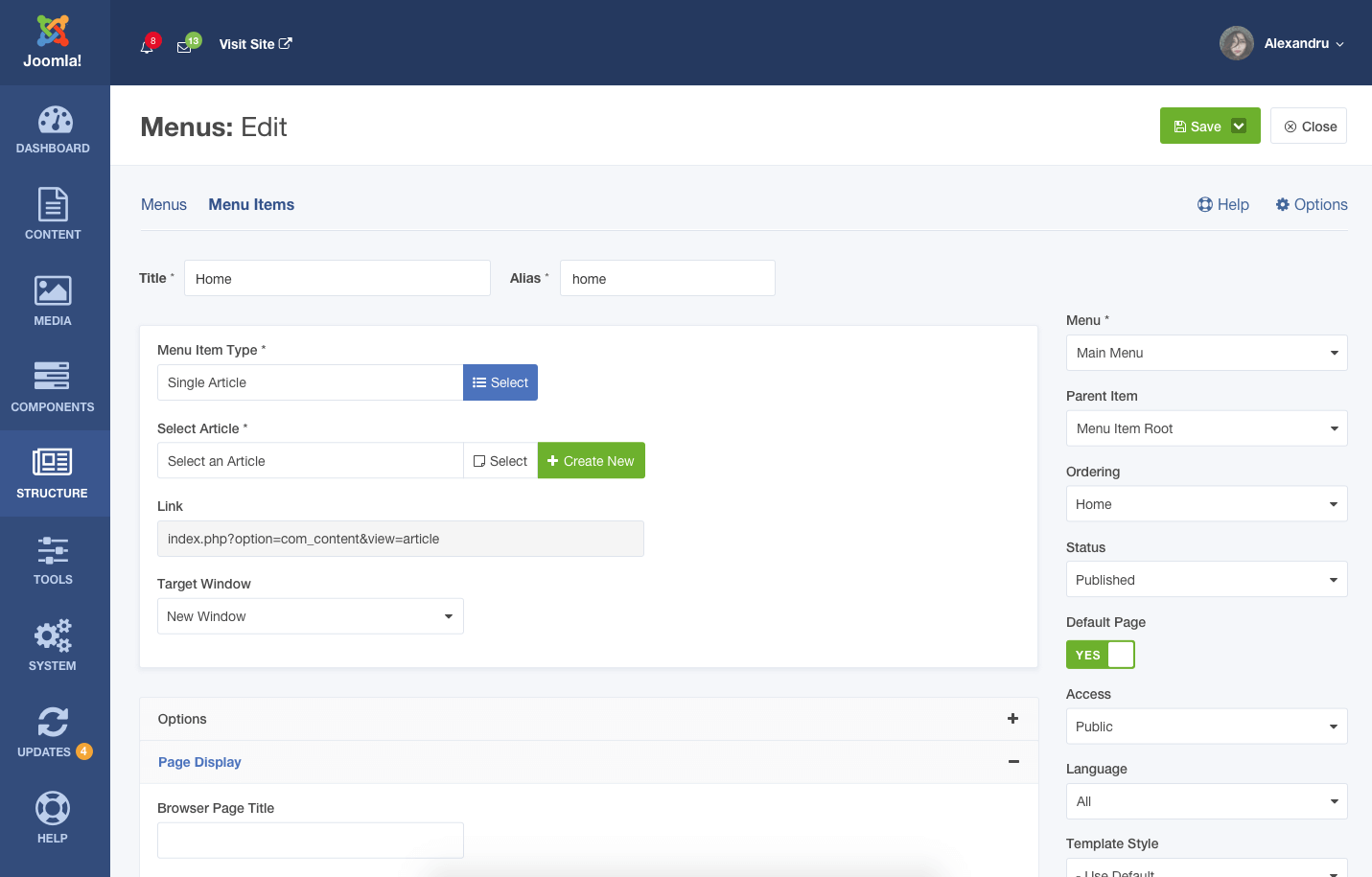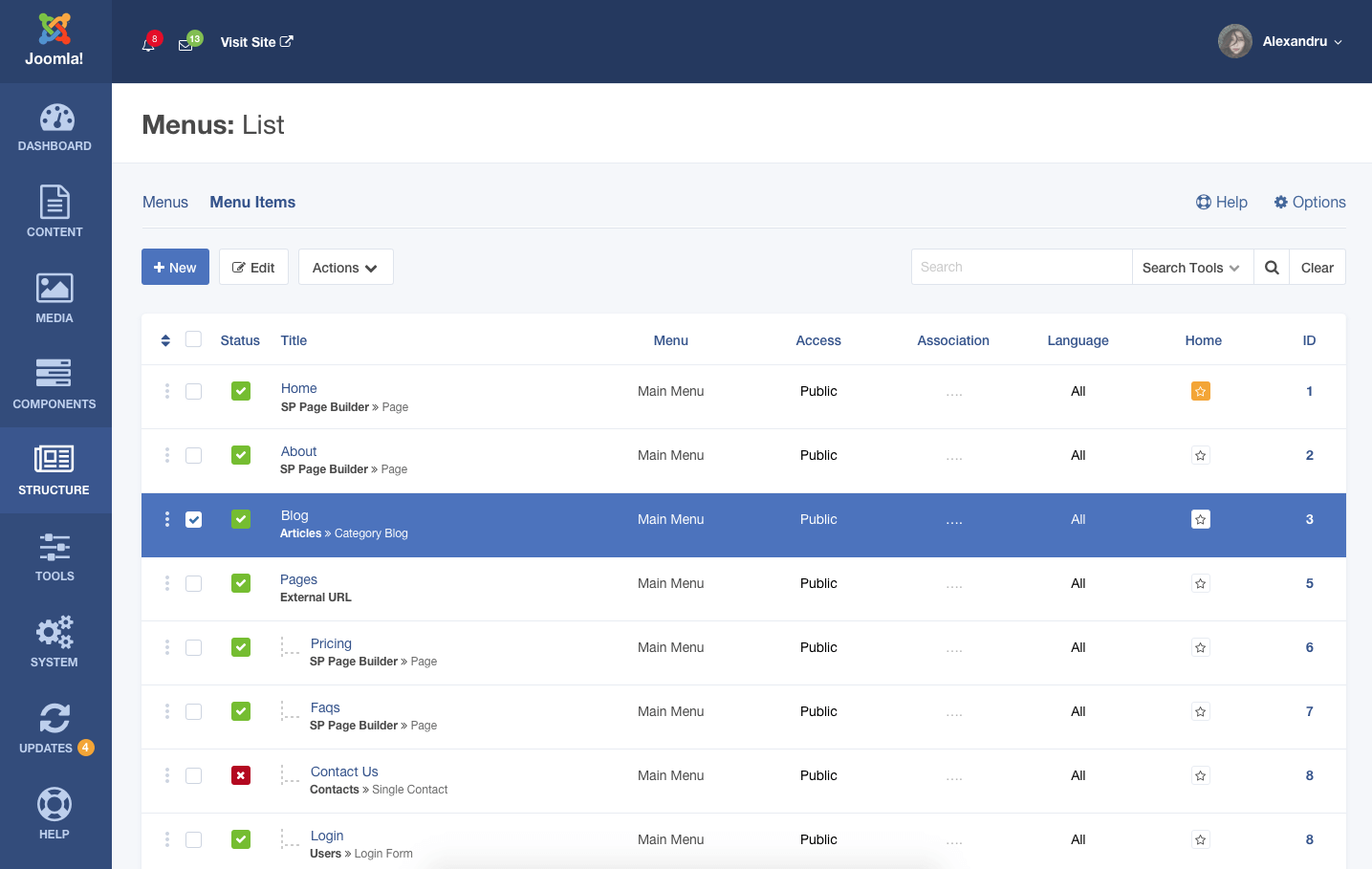 Joomla'nın mevcut navigasyon menü sistemi iyi olmasına rağmen, Joomla! 4 için görsel olarak geliştirilmiş bir menü listeleme ve düzenleme arayüzü oluşturulmuş.
