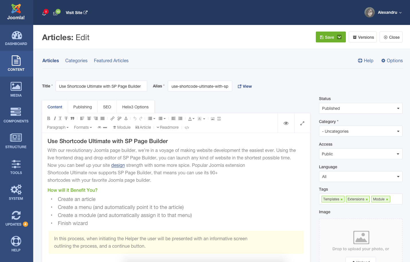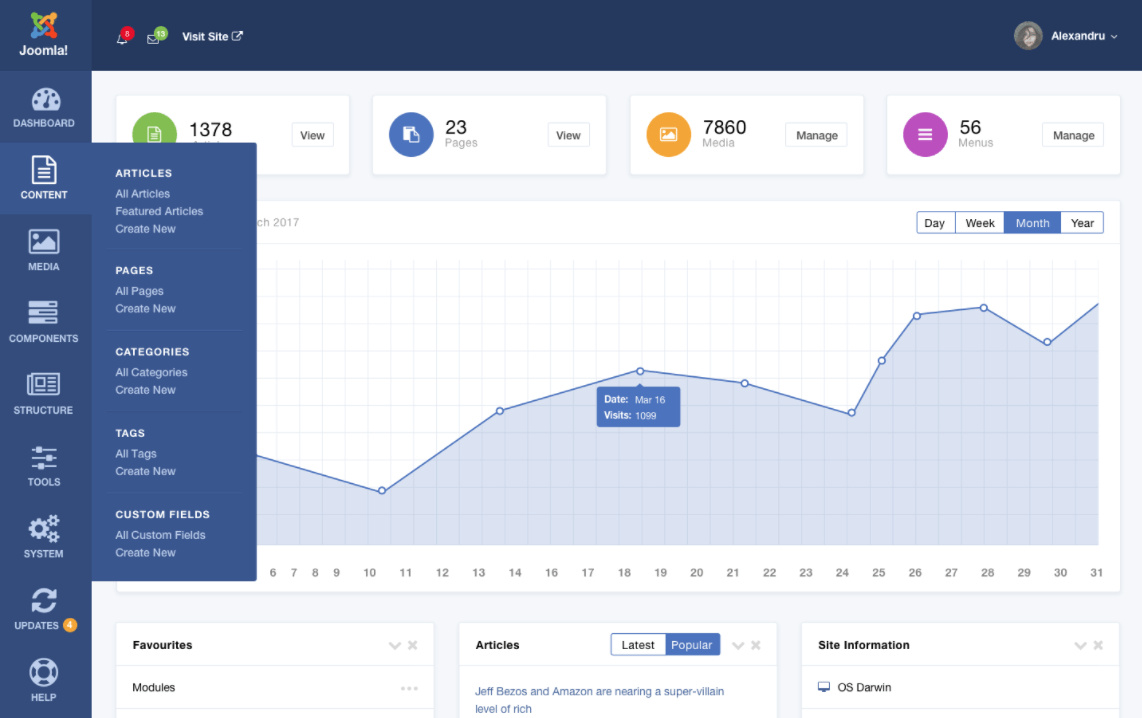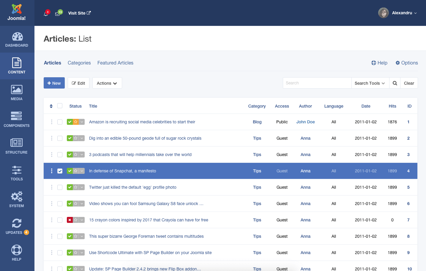 Kenar çubuğunda İçerik menüsü altında Makaleler, Sayfalar, Kategoriler, Etiketler ve Özel Alanlar bulunmakta. Fare ile üzerine gelince iç seçenekleri gösterecek bir açılır menü şeklinde'dir. Joomla! 4 konsept tasarımında, yöneticilerin makaleleri daha kolay görüntüleyip düzenlemelerini sağlayacak daha temiz bir makale listesi sayfası hazırlanmış.