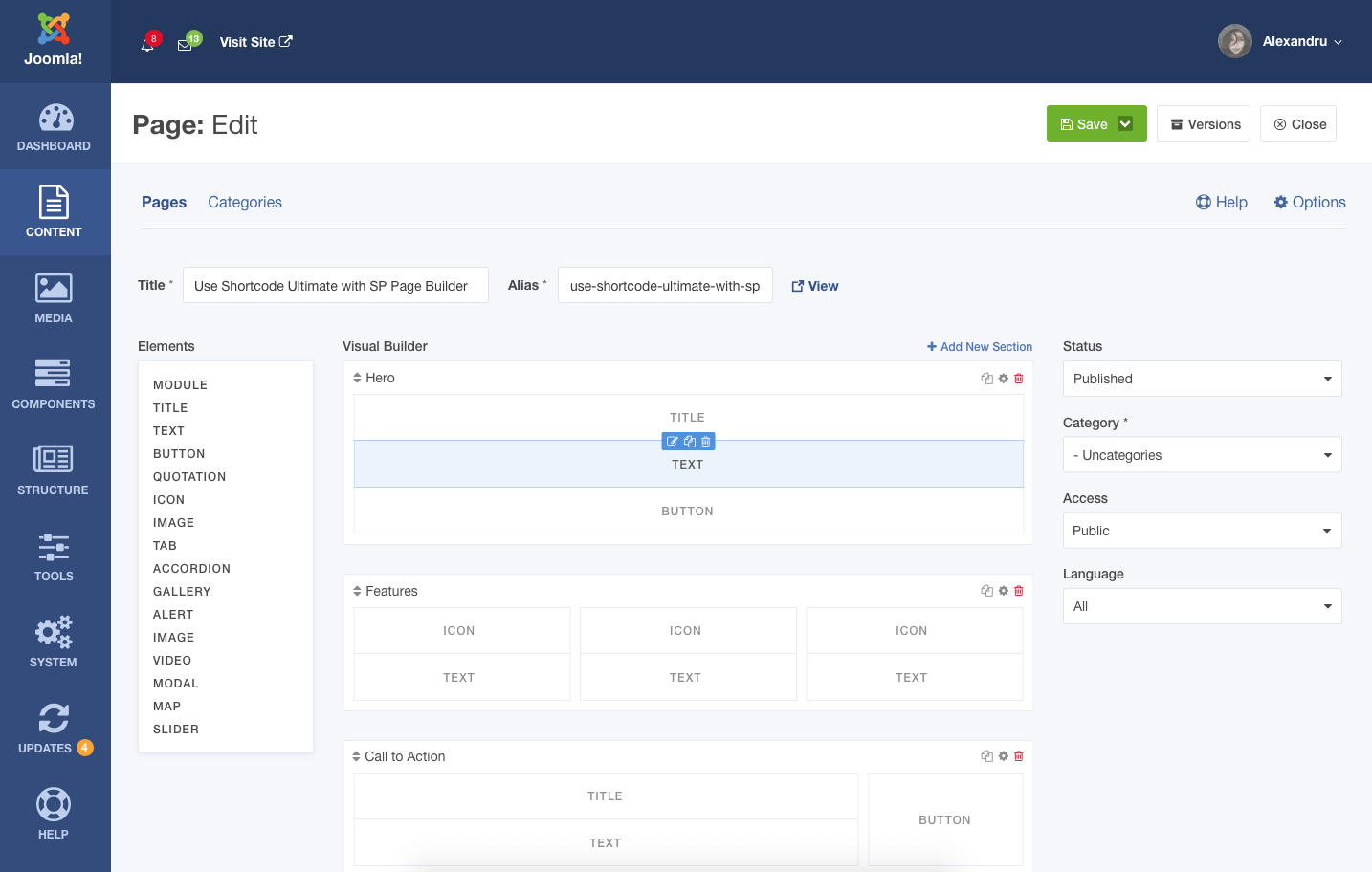 Web sitelerini inşa ederken sayfalar gereklidir. Bir web sitesinin ana sayfası, iç sayfalar ve diğer sayfaların Joomla! ile oluşturulması gerekiyor. Bu nedenle, sayfaların çok daha fazla özellikleri ve işlevsellikleri olması gerekiyor. Joomla! 4 admin panel konsept tasarımında, yerel bir sayfa oluşturucu bulunmaktadır. Daha kolay web sitesi sayfaları oluşturmak ve iş akışını kolaylaştırmak için "sürükle-bırak" özelliği ile sayfa oluşturma sistemi kullanılmakta.